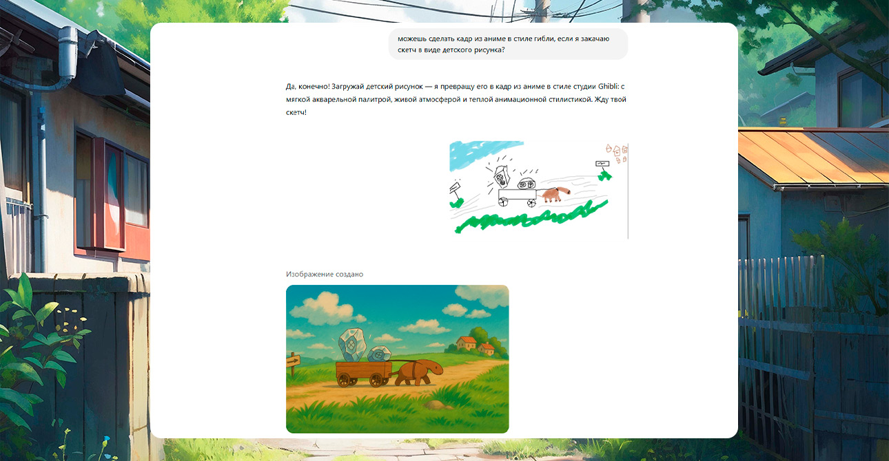Интернет захватил новый тренд — «Ghiblification ». Люди берут обычные фотографии, мемы, кадры из фильмов, и стилизуют их так, будто это сцена из мультфильма студии Ghibli: с мягкими пастельными тонами, воздушными пейзажами и лёгкой сказочной дымкой.