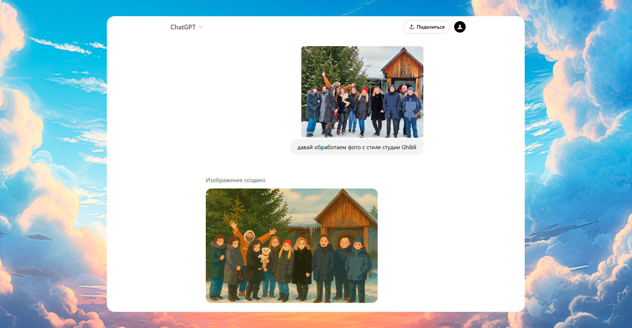 Во многом тренд сформировался благодаря тому, что ChatGPT научился обрабатывать фото без каких-либо сложных запросов. Достаточно загрузить фото и попросить его обработать в нужном стиле.