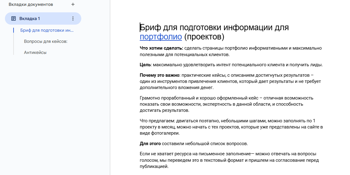- Составляем брифы для кейсов из вашей практики и размещаем их на сайте.