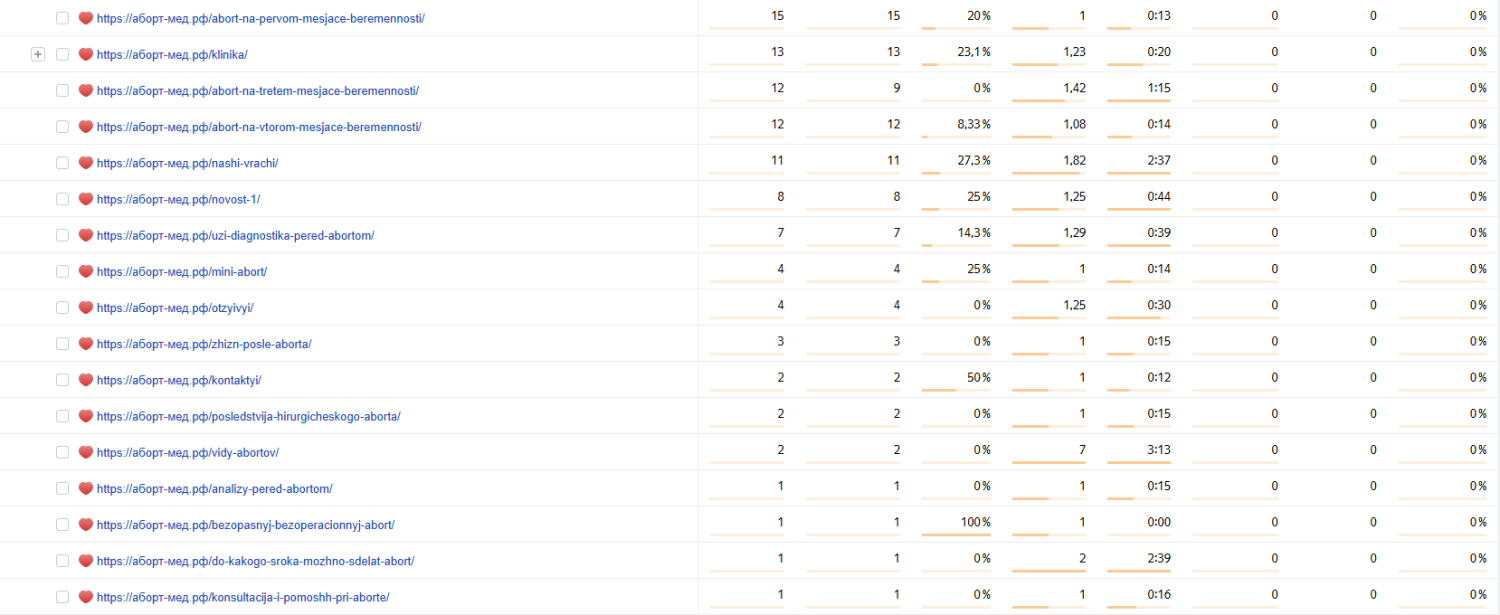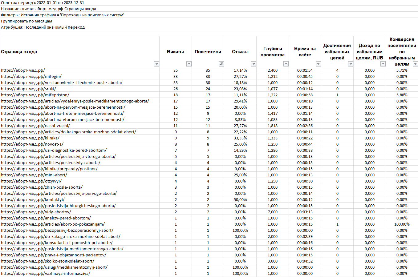 С помощью сервиса Яндекс.Метрика провели детальный анализ посещаемости всех страниц текущего сайта в течение последнего года. Среди них были выделены услуги и статьи, которые либо не вызывали интереса у аудитории сайта, либо не были достаточно качественными — для некоторых из таких страниц приняли решение их переработать в дальнейшем в рамках SEO, часть некачественных страниц удалили.