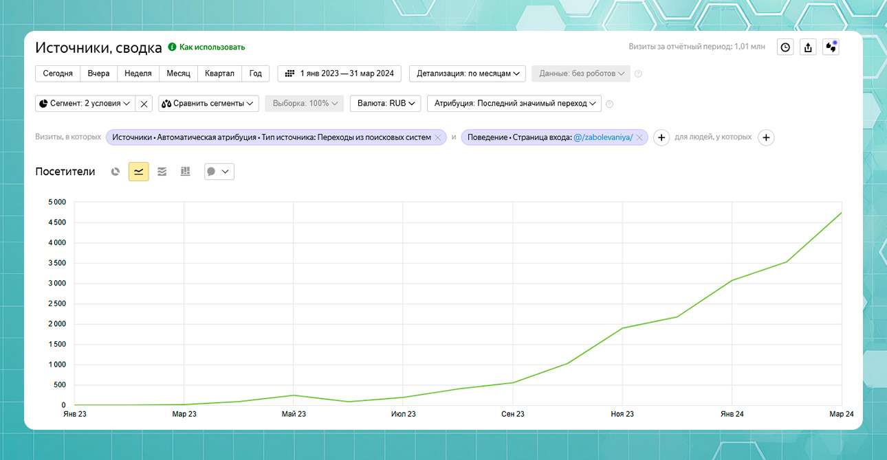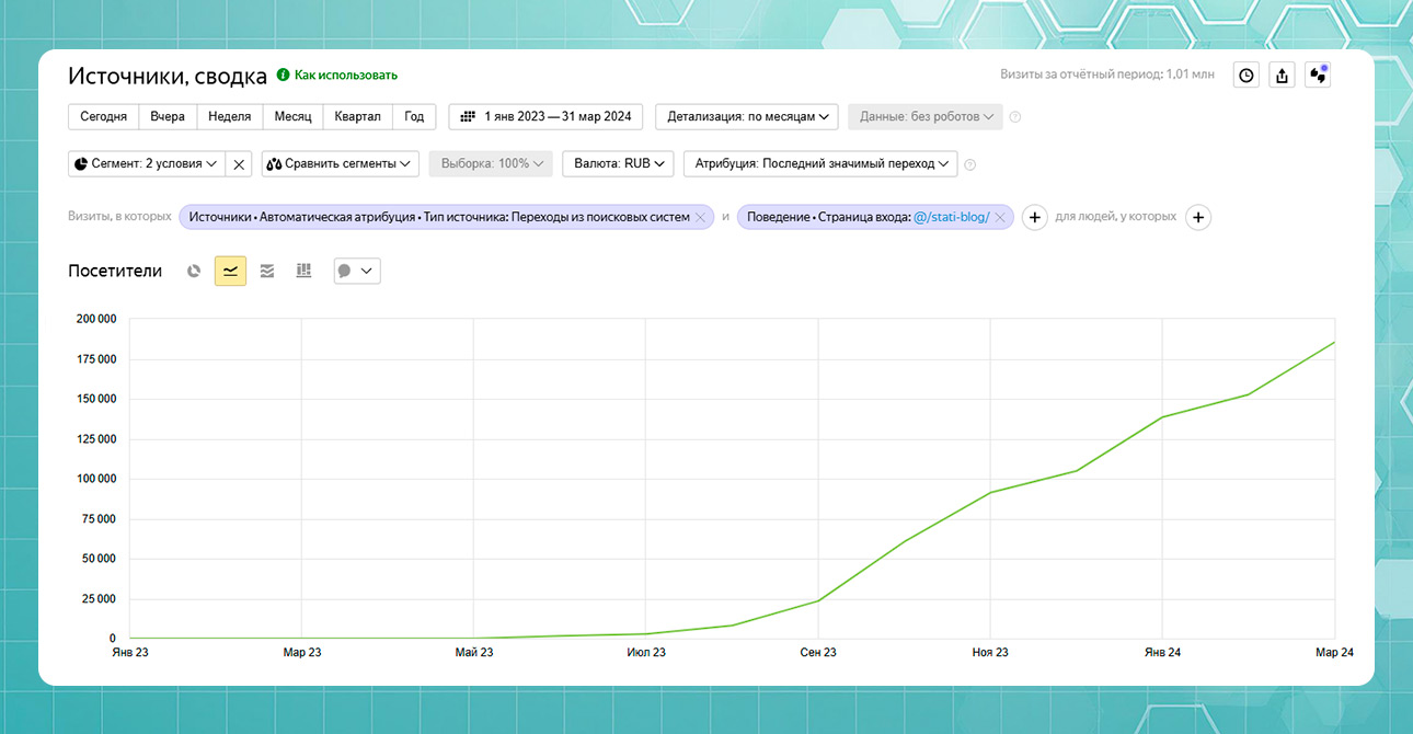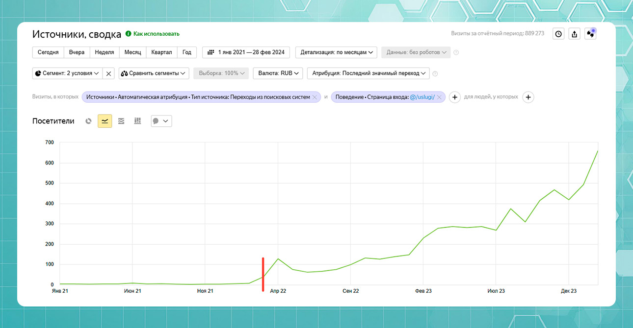 Подготовка и размещение инфоконтента на сайте дало солидный прирост поискового трафика.