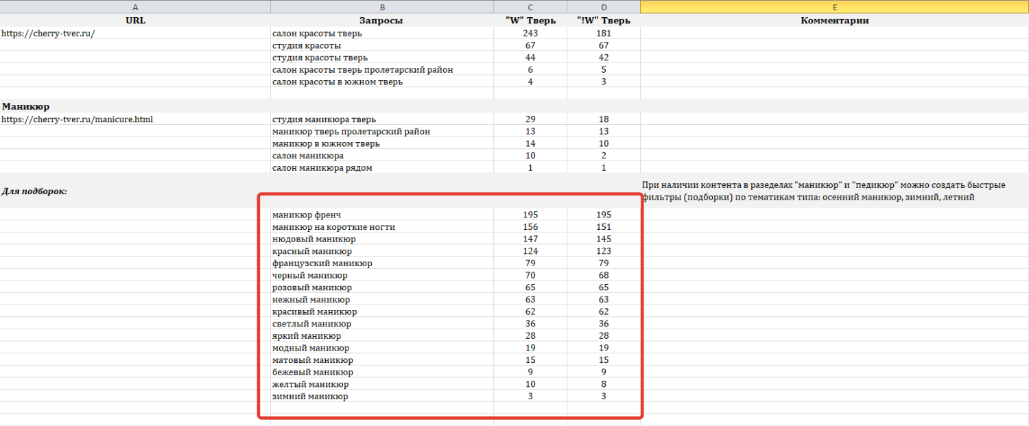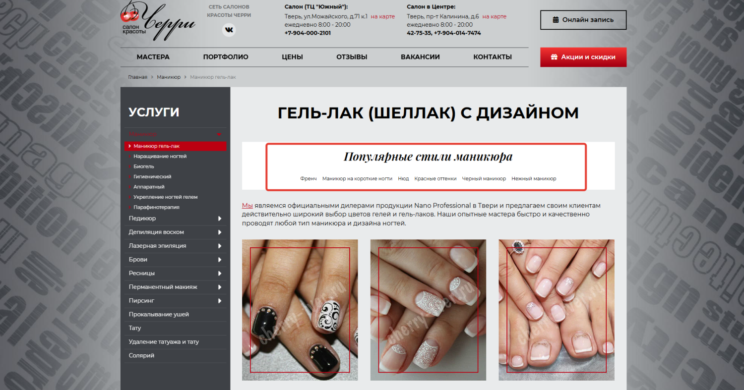 - Собрали и кластеризовали семантическое ядро, охватывающее все ключевые услуги салона, а также на основе анализа спроса предложили дополнительные тематические разделы и страницы, которые позволили бы расширить структуру сайта и привлечь новый целевой трафик по низко- и среднечастотным запросам, которые ранее не использовались. На этом этапе предусмотрели возможность для роста сайта через тематические подборки, например виды маникюра: