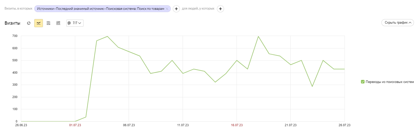 - Настроено формирование товарного фида для получения дополнительного органического трафика (порядка 10-15 тыс. дополнительных визитов в месяц, в т.ч. оканчивающихся совершенными заказами).