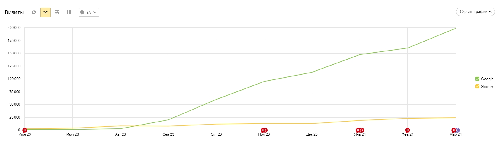 С момента окончания разработки и тестирования нового сайта было начато SEO-продвижение ресурса.