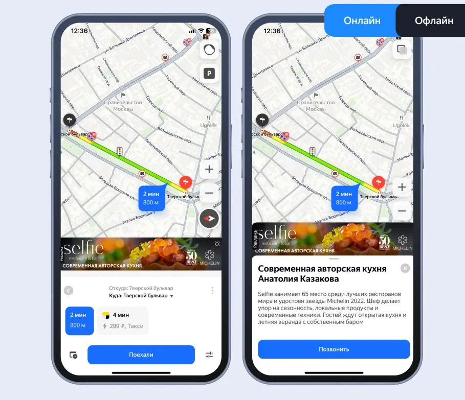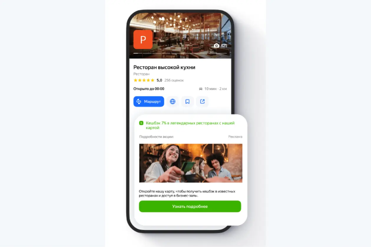 Пользователю предлагается заехать в вашу точку продаж по пути к конечной цели, что усиливает узнаваемость бренда и привлекает больше посетителей. Этот формат нативно интегрирован в процесс выбора маршрута и предлагает только те места, которые не увеличат время в пути. Вы платите только за тех клиентов, которые действительно начнут поездку с заездом в вашу точку. Идеально подходит для сетей с несколькими офлайн-точками, особенно в сфере фастфуда и ритейла.