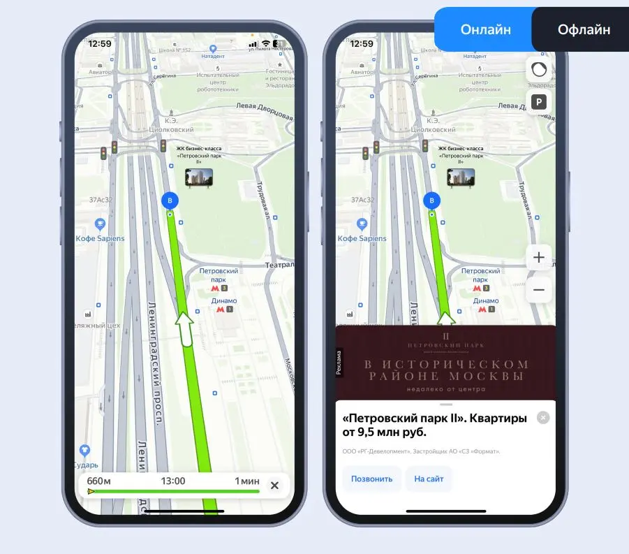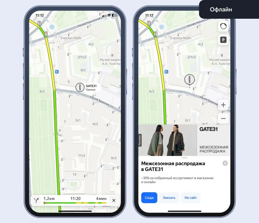 Пины в навигаторе — это эффективный способ привлечь внимание к вашему бренду, размещая рекламные метки с логотипом прямо на маршрутах пользователей. Эти пины не только повышают узнаваемость, но и информируют о ваших специальных предложениях в конкретных местах. Кликнув на метку, пользователь сможет увидеть баннер с рекламой, перенастроить маршрут с остановкой у вас, позвонить или перейти на сайт.