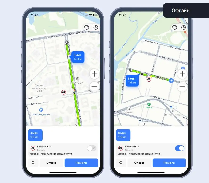 Это рекламный формат с оплатой по CPA — вы платите только за старт поездки по перестроенному маршруту — с заездом в вашу точку продаж.